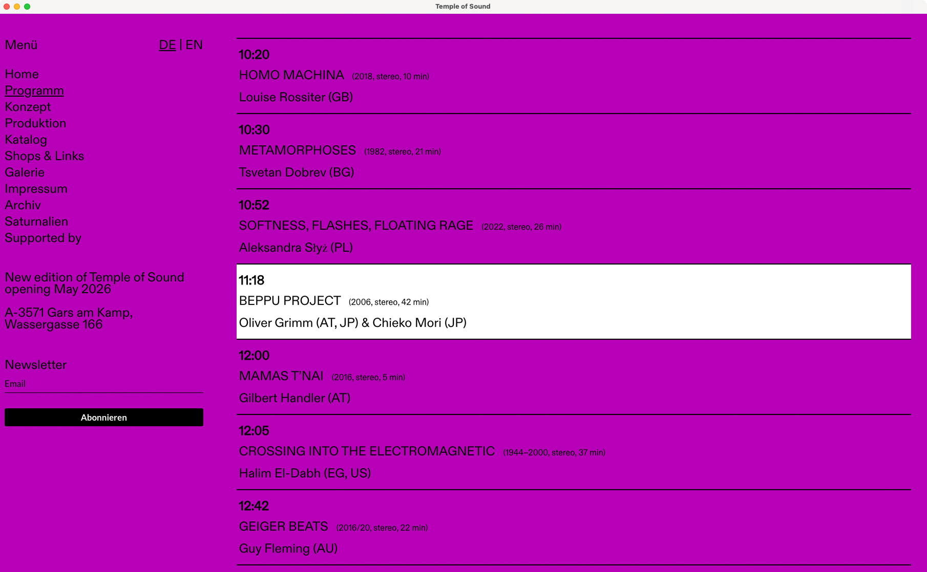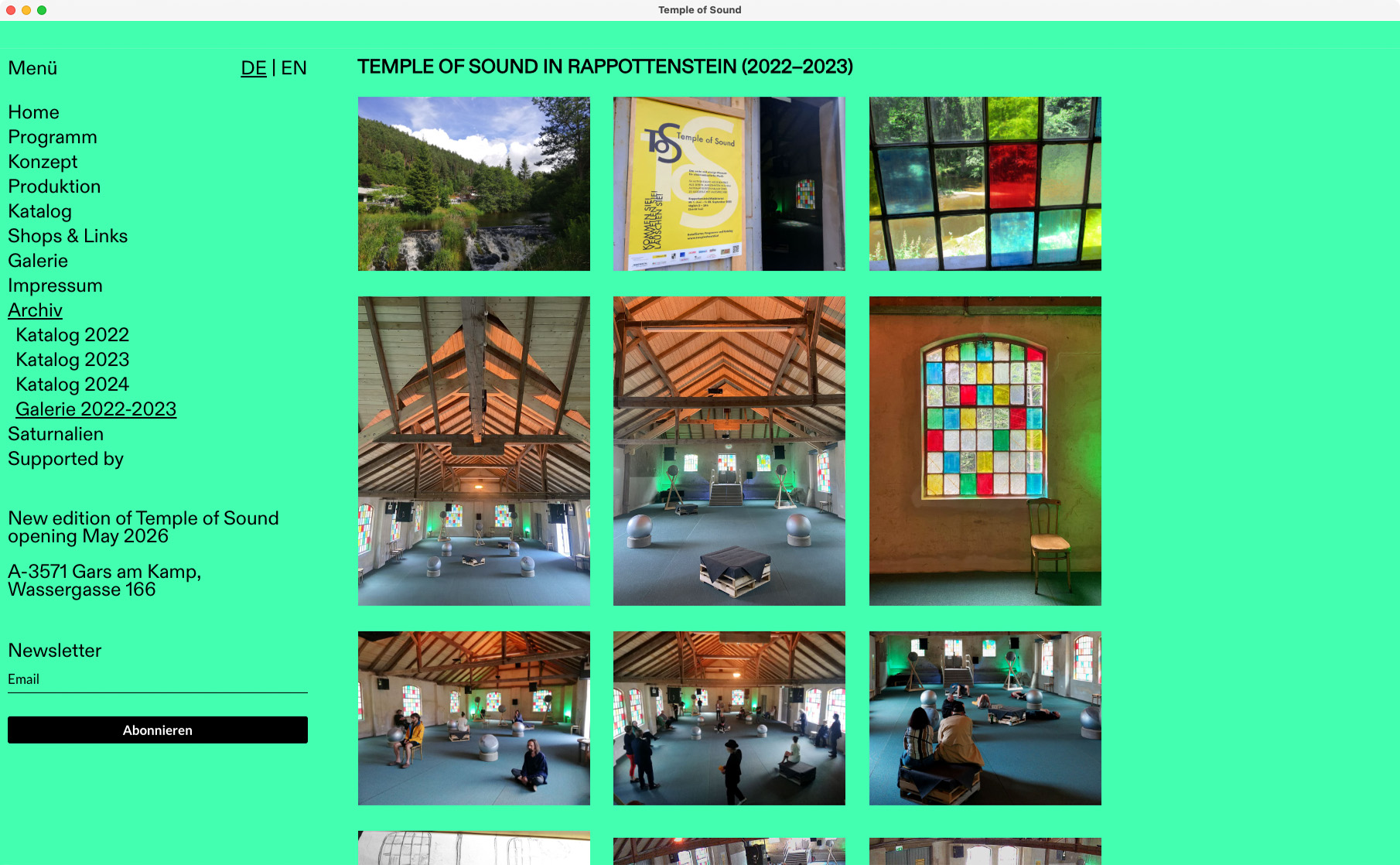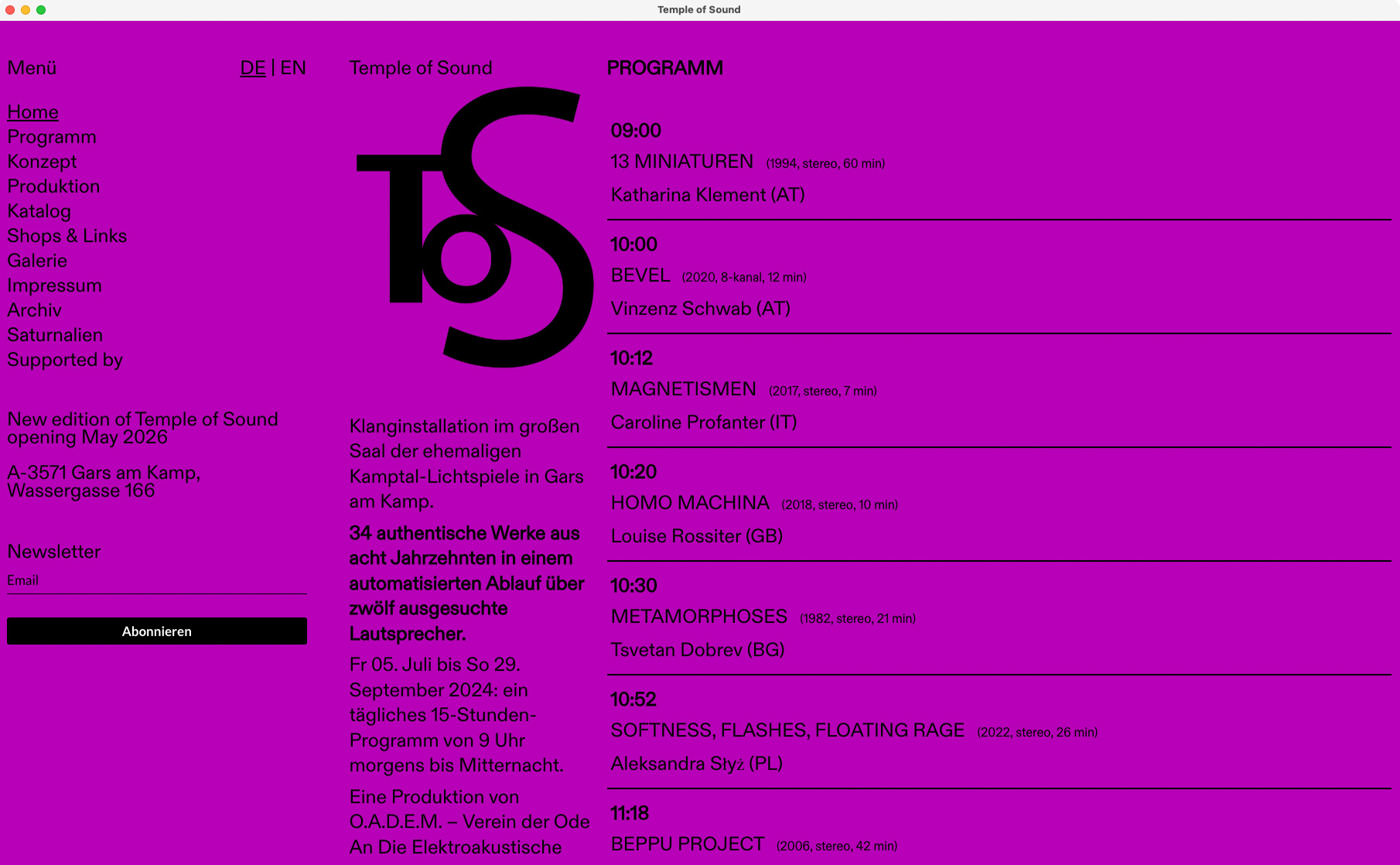 Temple of Sound is a yearly sound installation festival held in the old Kamptal-Lichtspiele cinema in Gars am Kamp. Curated by O.A.D.E.M. and Gars Electronica, it’s an ode to electroacoustic music – featuring 34 original works played in programmed sequence. Since 2022, we’ve supported the project with a semi pro-bono website that gives the event a digital presence to match its analogue beauty.