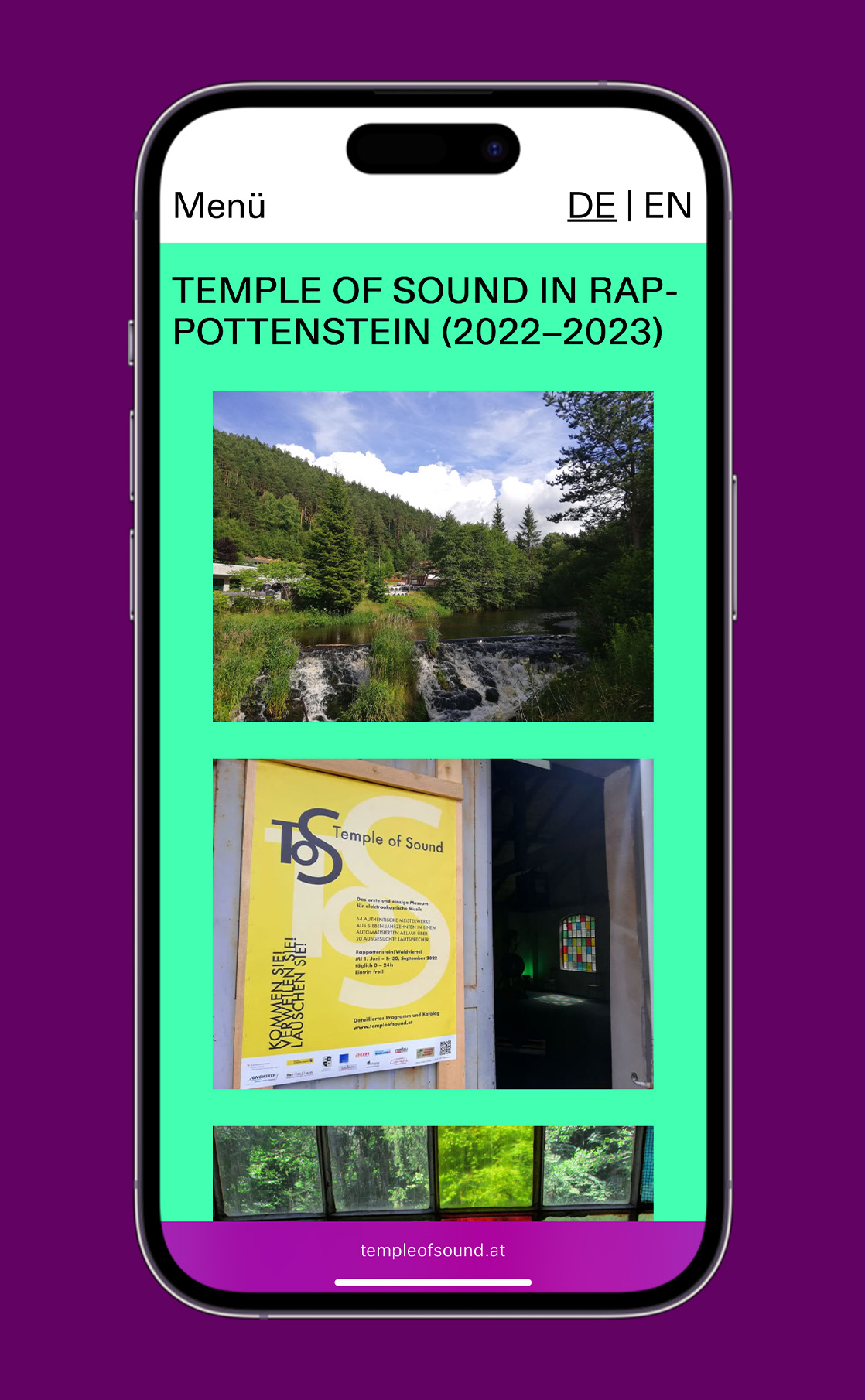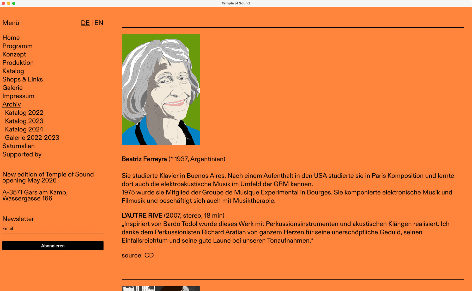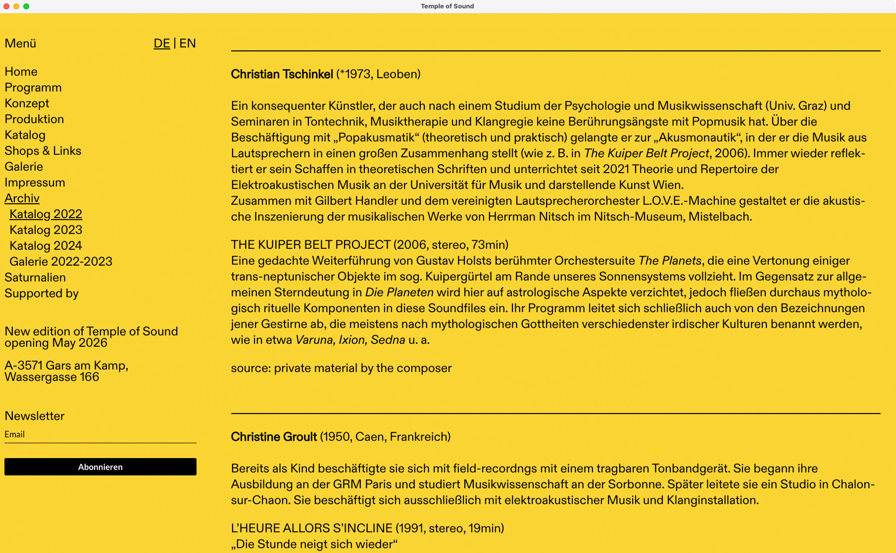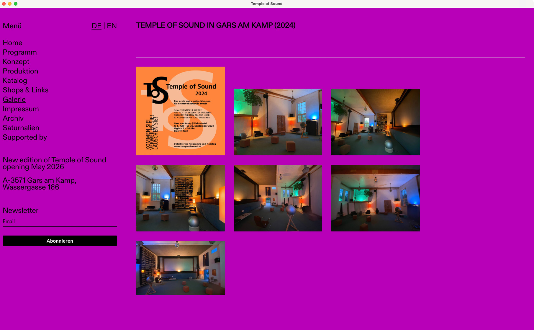 Temple of Sound is a yearly sound installation festival held in the old Kamptal-Lichtspiele cinema in Gars am Kamp. Curated by O.A.D.E.M. and Gars Electronica, it’s an ode to electroacoustic music – featuring 34 original works played in programmed sequence. Since 2022, we’ve supported the project with a semi pro-bono website that gives the event a digital presence to match its analogue beauty.
